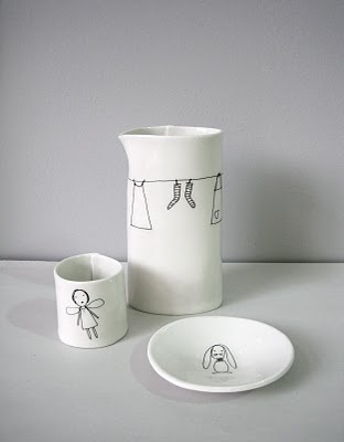 i recently did a collaboration with jess brown. she makes these incredibly lovely handmade dolls using recycled + antique fabrics/findings. my handmade porcelain picnic set is fully functional, so your little ones can have their own little tea party. the set comes with 1 pitcher, 2 cups and 2 dishes. two for tea anyone ?